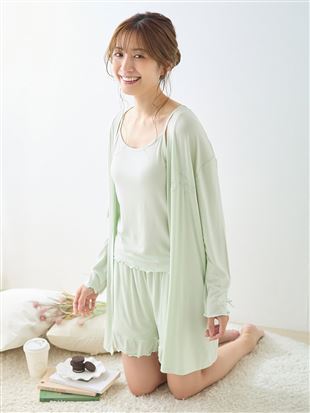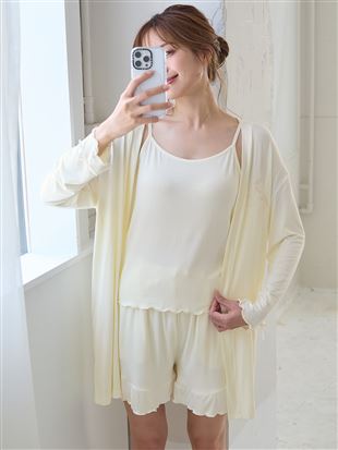 キャミソール・ショートパンツ・カーディガンの3点がセットになったカップ付きルームウェア。<br><br>【デザイン】<br>・カップ付きのキャミソールは、細めの肩紐で程よい抜け感と華奢見えを演出。アジャスターで調整可能なのも嬉しいポイント◎<br>・クロスストラップは前後どちらでも着用できる2way仕様で、着こなしの幅が広がります。<br>・カーディガンには同色の刺繍を胸元にあしらい、さりげないアクセントに。<br>・ショートパンツは裾をメロー仕上げにし、ほんのり甘さをプラス。<br>・シンプルながらもディテールにこだわった、大人フェミニンなルームウェア3点セットです。<br><br>【1日中お胸をサポート!カップ付きキャミのこだわり仕様】<br>・サイドパネルと脇のパーツでどんな体勢になっても脇にバストが流れにくい。<br>・ストレッチ性のある柔らかいモールドカップが1日中お胸にフィット。<br>・カップの下部分に程よく厚みがあるので、お胸をふんわり持ち上げて楽にシルエットメイク。<br><br>