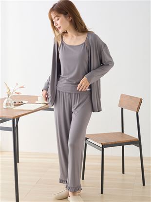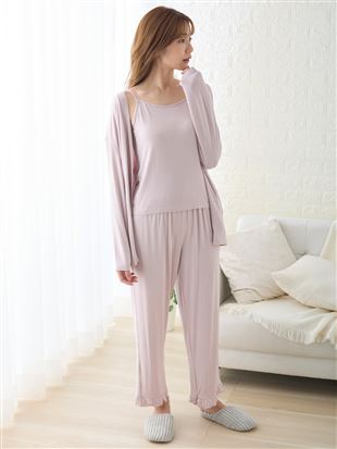キャミソール・ロングパンツ・カーディガンの3点がセットになったカップ付きルームウェア。<br><br>【デザイン】<br>・ダブルストラップ仕様のキャミソールは、細めのストラップが華奢見えを叶えるデザイン。<br>胸元には小さなロゴ入りメタルチャームを添えて、さりげないアクセントに。<br>・カーディガンはシンプルな無地デザイン。丸首と少し短めの丈感で、バランスよく着こなせる1枚です。<br>・ロングパンツは裾にスリットを入れることで、動きやすさと抜け感をプラス。<br>シンプルながら、こだわりの詰まった大人フェミニンなルームウェアです。<br><br>【1日中お胸をサポート!カップ付きキャミのこだわり仕様】<br>・サイドパネルと脇のパーツでどんな体勢になっても脇にバストが流れにくい。<br>・ストレッチ性のある柔らかいモールドカップが1日中お胸にフィット。<br>・カップの下部分に程よく厚みがあるので、お胸をふんわり持ち上げて楽にシルエットメイク。<br><br>