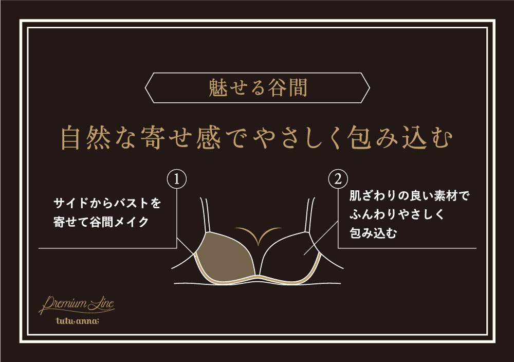インポートランジェリーを彷彿とさせる、洗練されたデザインが魅力のPremium Line。<br><br>【デザイン】<br>大輪の花々と小さな木の実を描いた、繊細な刺繍レースが印象的な1枚。<br>存在感のある花柄も、アンティーク調のカラーでまとめることで、大人の深みを感じる仕上がりに。<br>カップに忍ばせたラメやラメ糸のさりげないきらめきが、レースの美しさを引き立ててくれます。<br><br>【仕様】<br>【-魅せる谷間タイプ-仕様】<br>・低反発のカップと肌側微起毛素材で、包み込まれるような優しい着け心地。<br>・総レース仕様のアンダーベルトで、後ろ姿まで色っぽく演出。<br>・寄せすぎないナチュラルな谷間で抜け感のあるスタイルに。<br><br>3種類のおそろいショーツや、キャミソールとのコーディネートもお楽しみ下さい。<br><br>