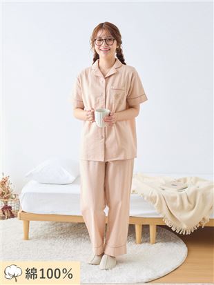 こちらのページは、[とにかくさらっと涼しい]綿100%ロゴ前開き無地サッカー半袖パジャマというルームウェア(部屋着)の商品詳細ページです。
