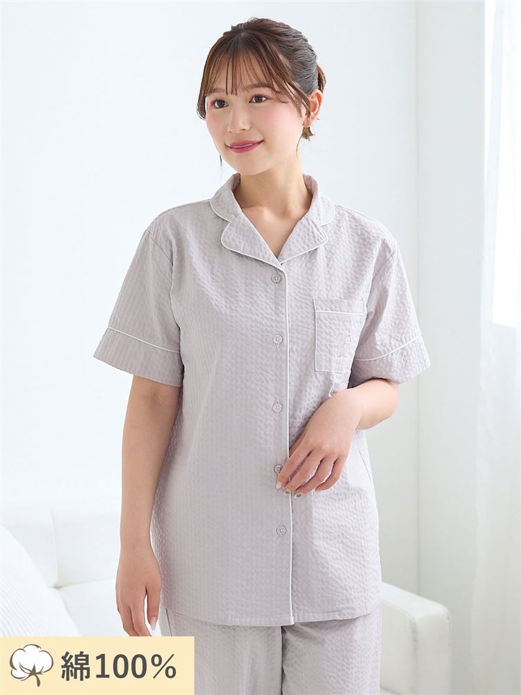 こちらのページは、[とにかくさらっと涼しい]綿100%ロゴ前開き無地サッカー半袖パジャマというルームウェア(部屋着)の商品詳細ページです。