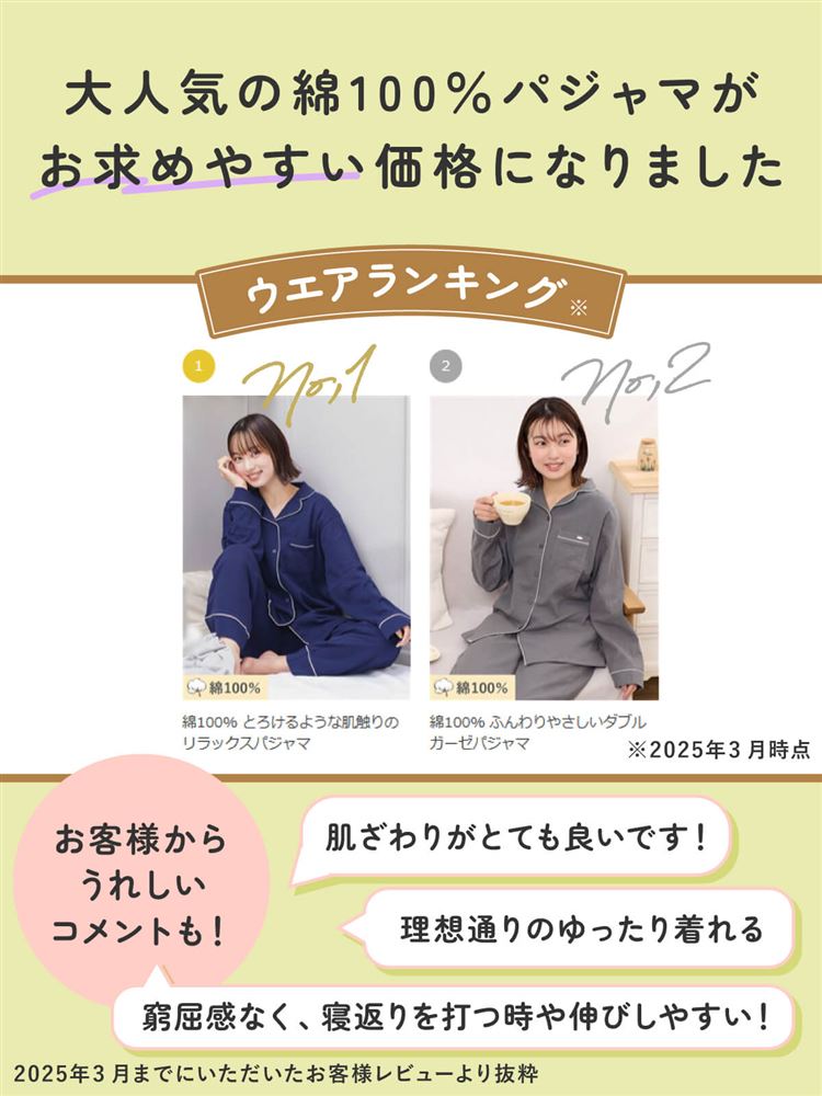 こちらのページは、【新価格】綿100% とろけるような肌触りのリラックスパジャマというルームウェア(部屋着)の商品詳細ページです。