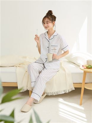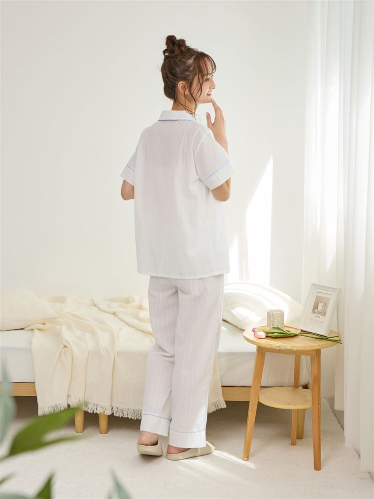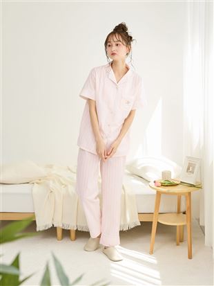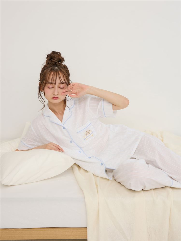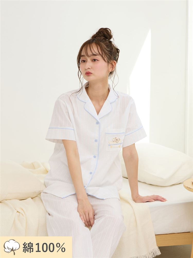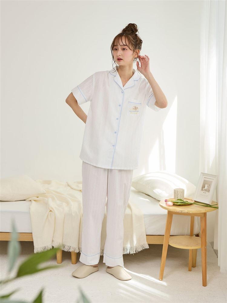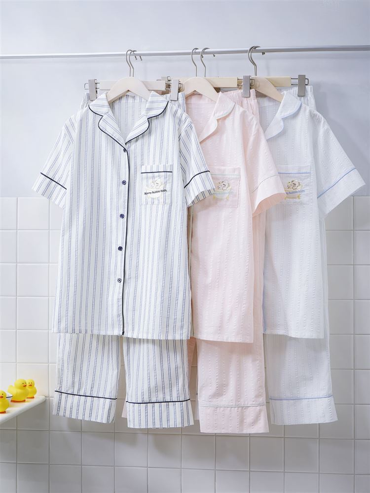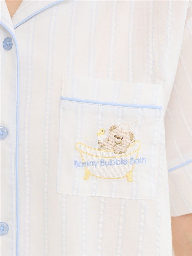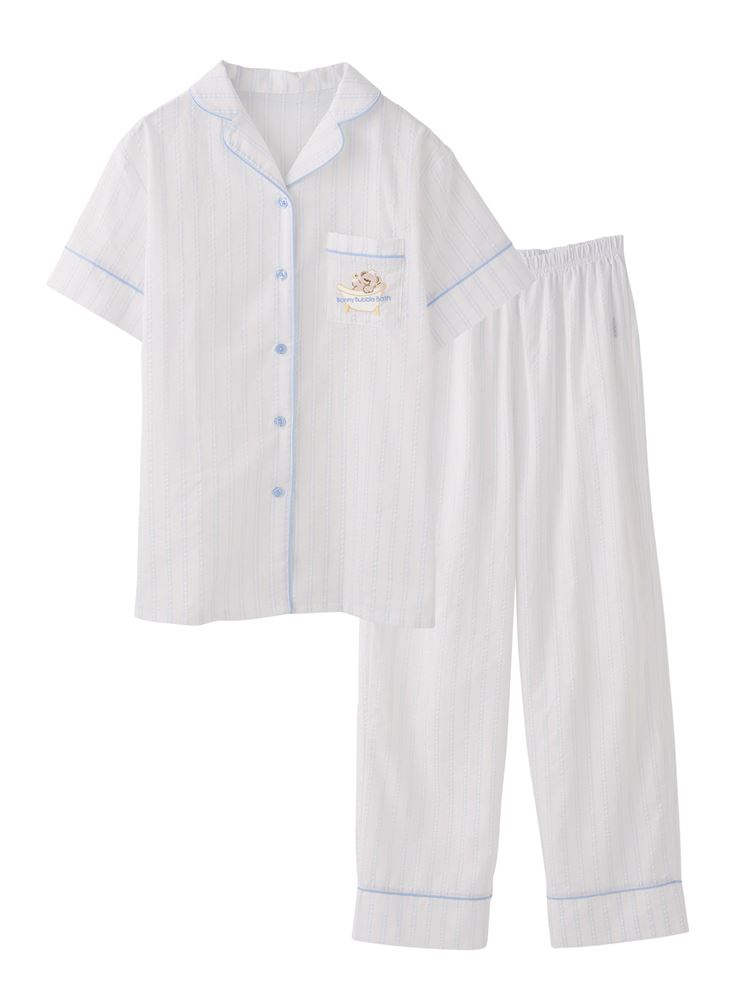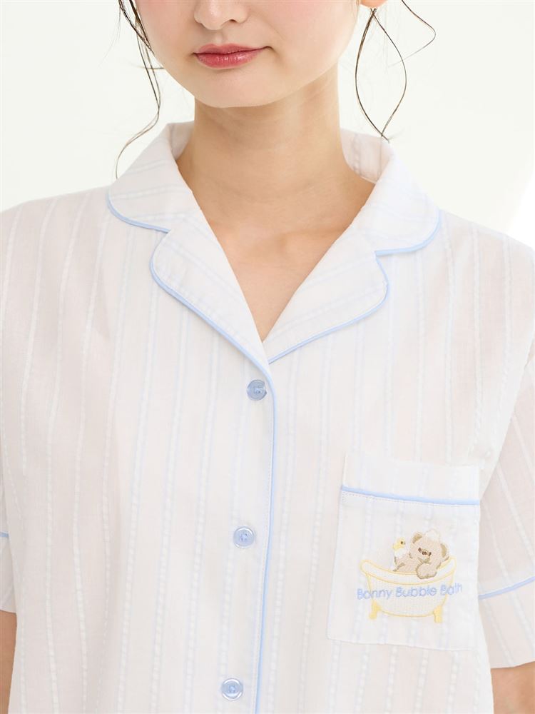 こちらのページは、綿100%バスタイムくま刺繍前開きサッカー半袖パジャマというルームウェア(部屋着)の商品詳細ページです。