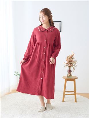こちらのページは、綿100%ふんわりガーゼ小花柄刺繍前開きワンピースというルームウェア(部屋着)の商品詳細ページです。