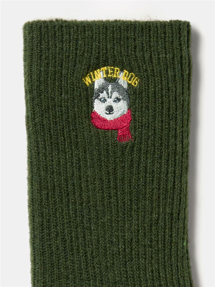 カシミヤ混ウィンタードッグ刺繍5本指ソックス16cm丈