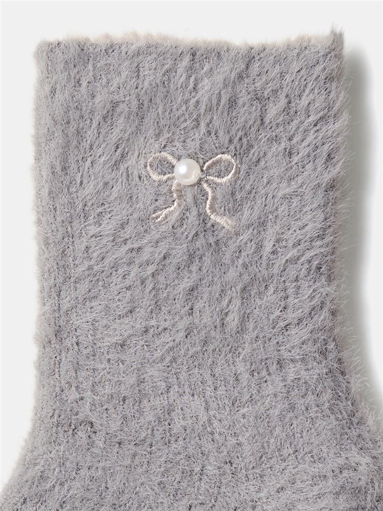 綿混くま刺繍リンクス縄柄ソックス14cm丈