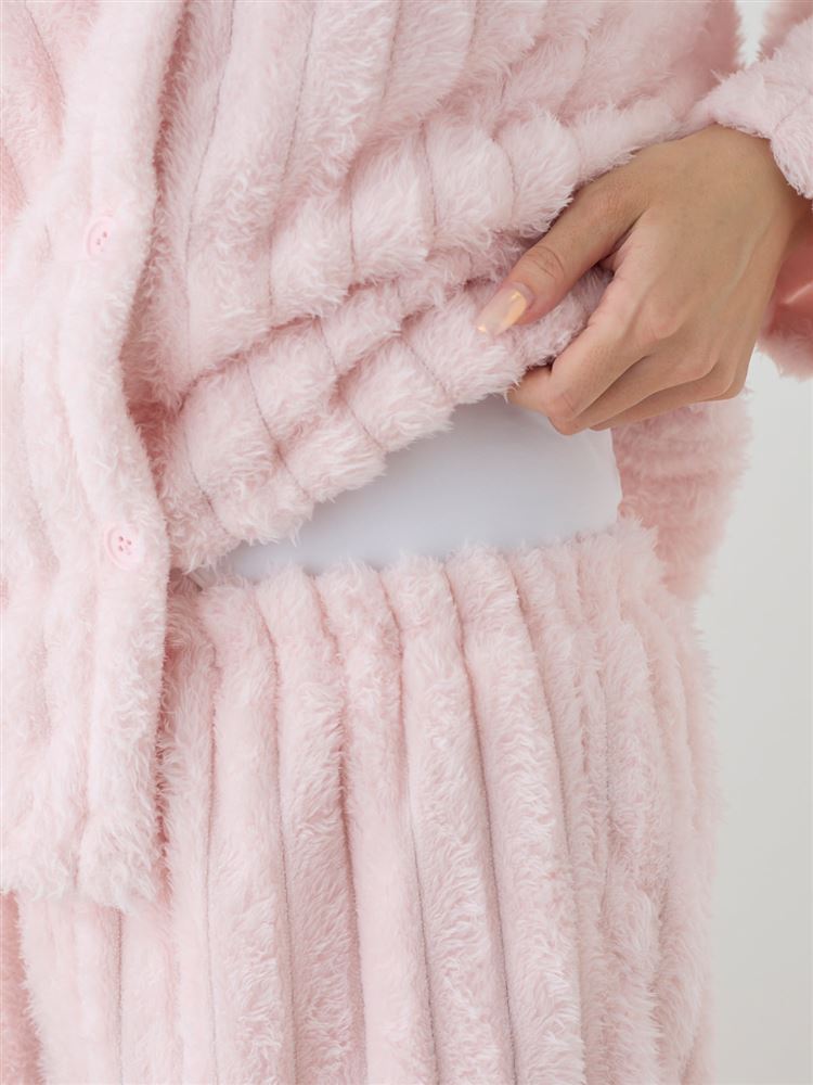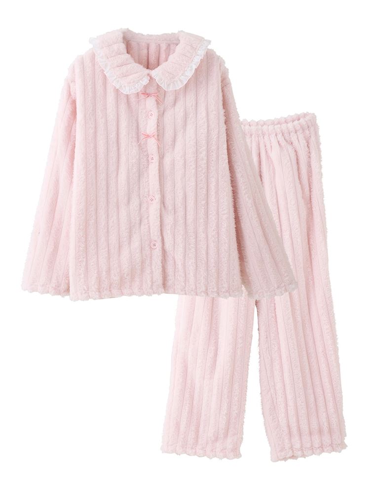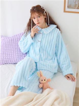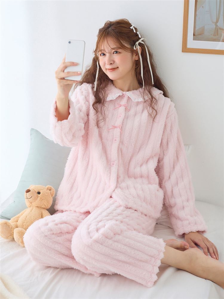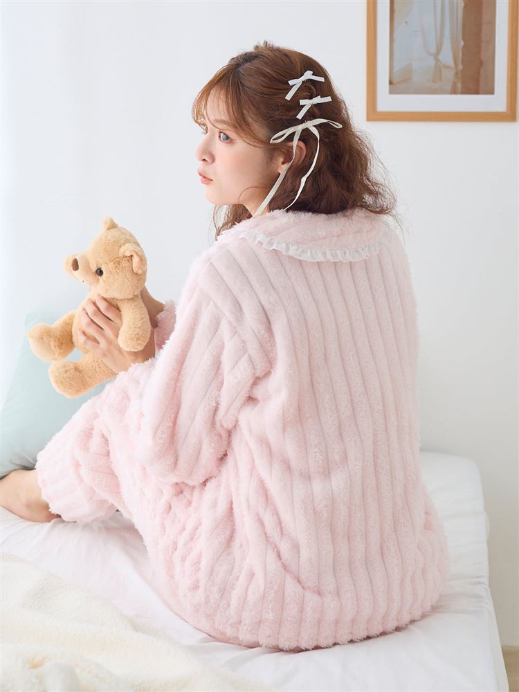 こちらのページは、[まるで毛布!のような暖かさ]リボン付きシフォンフリル襟前開きマイクロファイバーパジャマというルームウェア(部屋着)の商品詳細ページです。