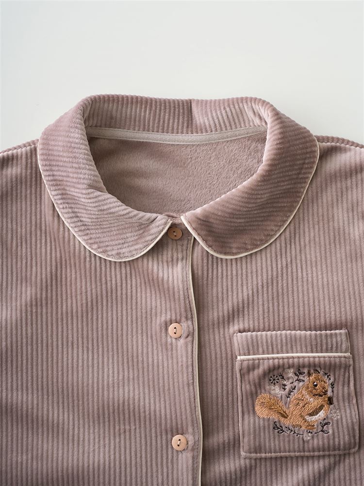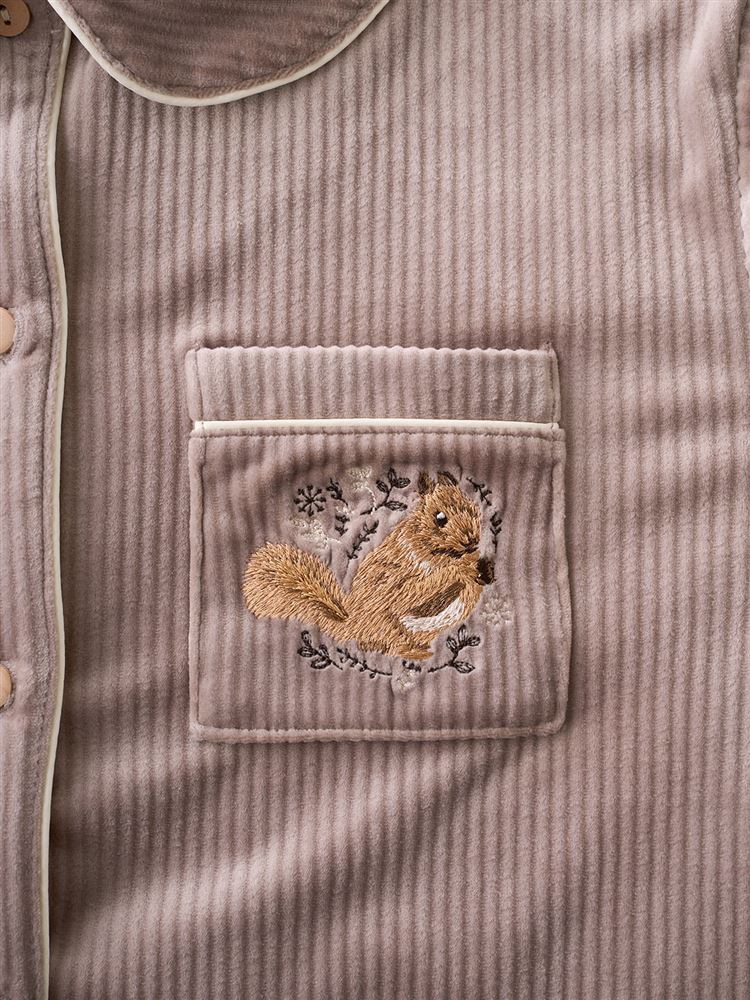 こちらのページは、腹巻き付きリス刺繍前開きベロアパジャマというルームウェア(部屋着)の商品詳細ページです。