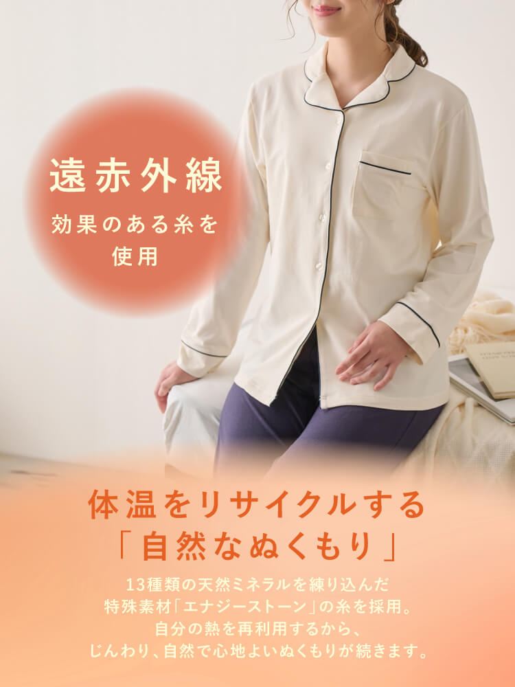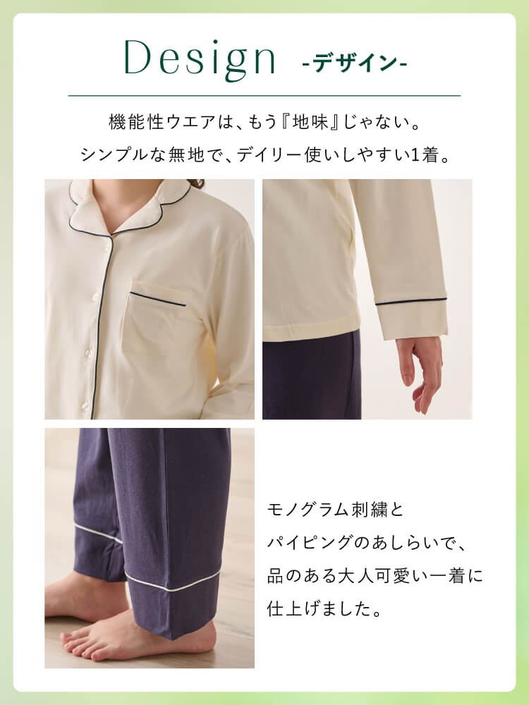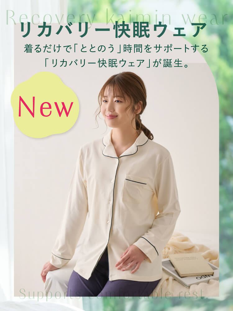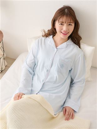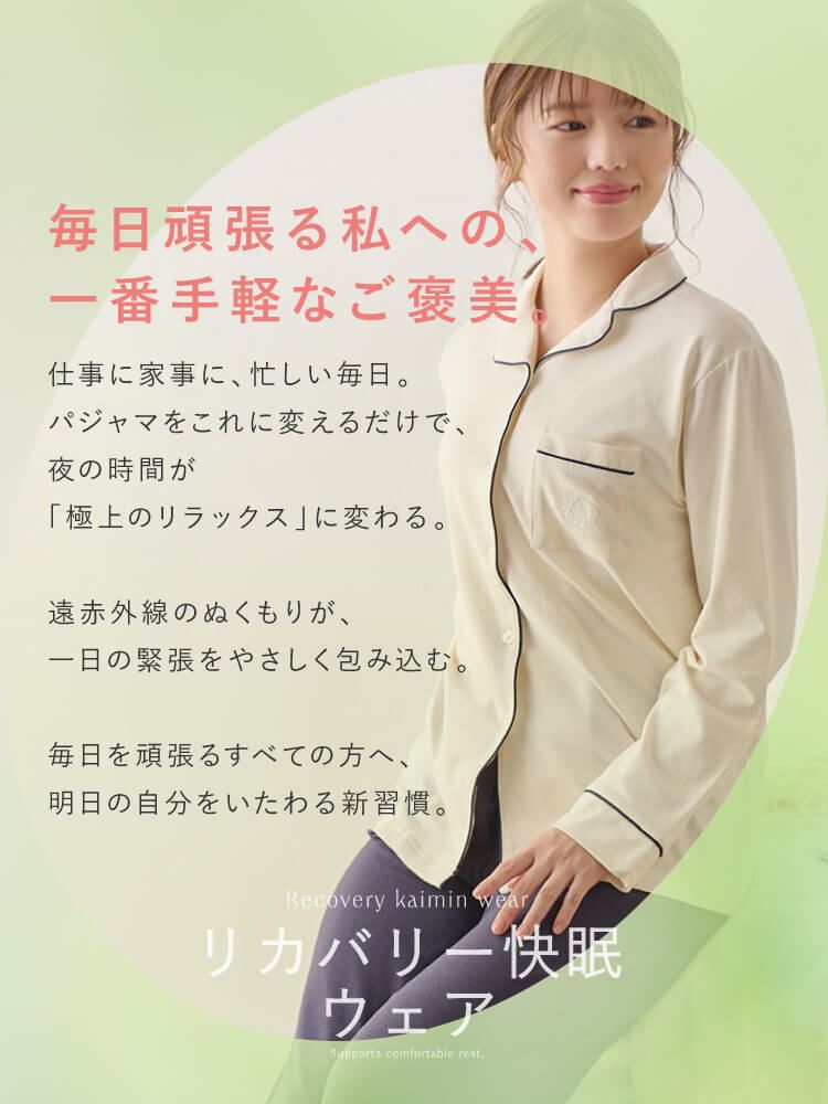 こちらのページは、[リカバリー快眠ウェア]ロゴ刺繍前開きパジャマというルームウェア(部屋着)の商品詳細ページです。