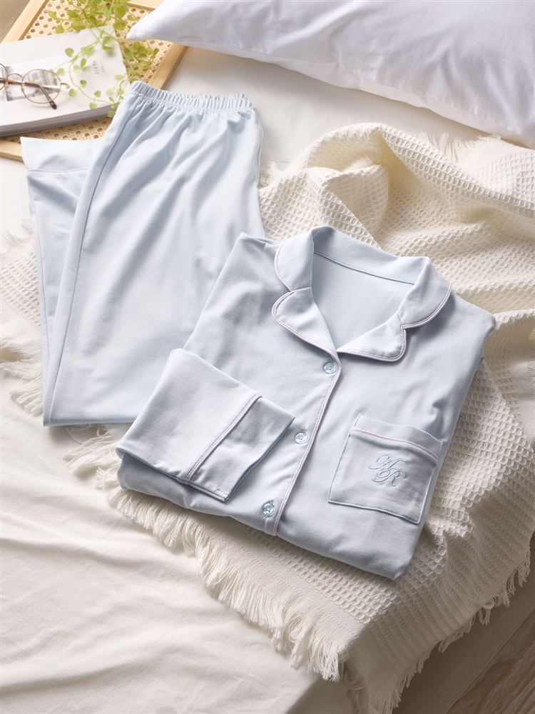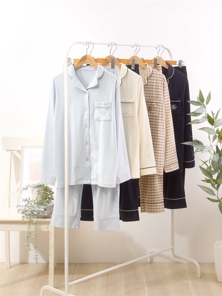 こちらのページは、[リラックス快眠ウェア]ロゴ刺繍前開きパジャマというルームウェア(部屋着)の商品詳細ページです。