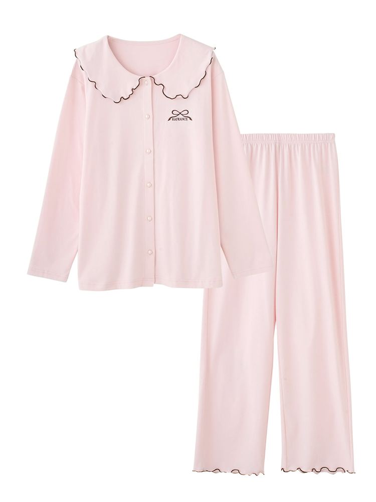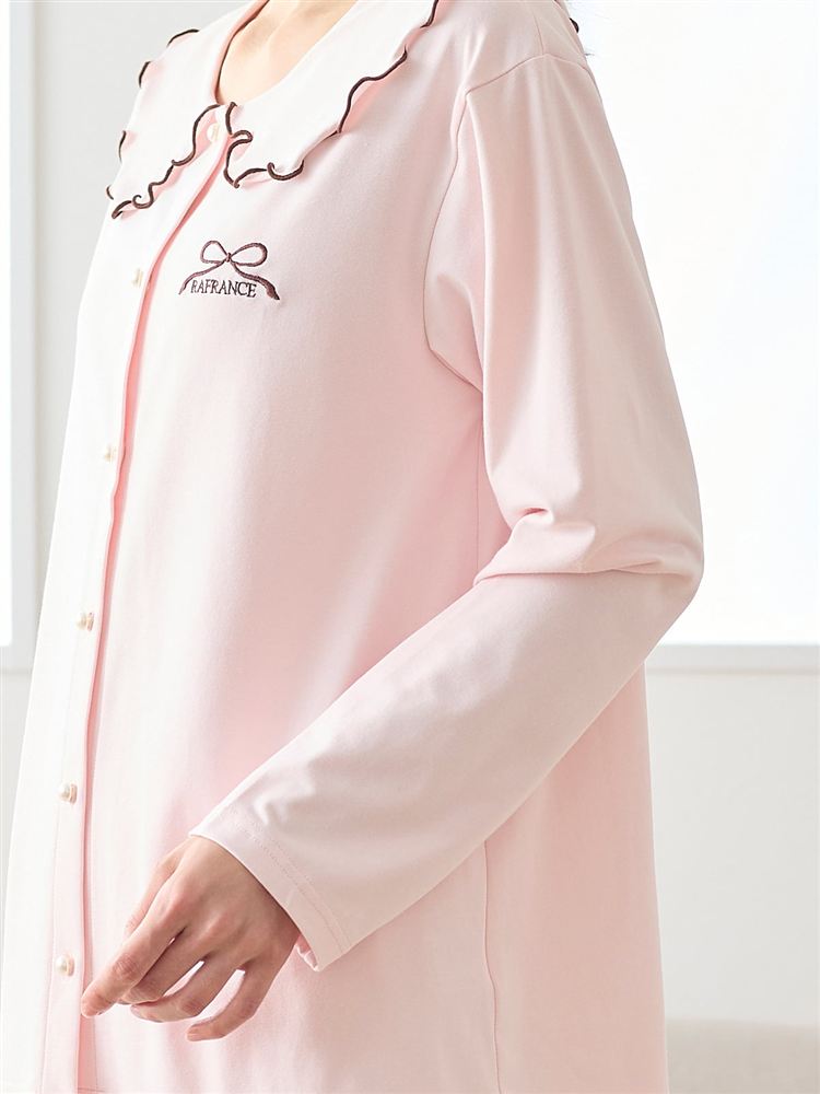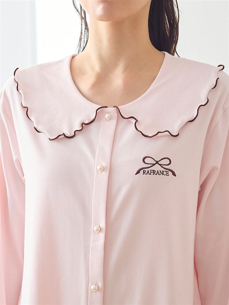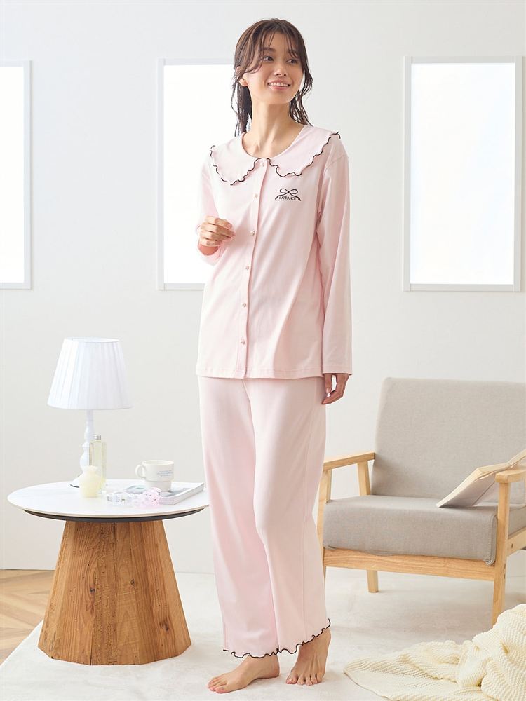 こちらのページは、[快眠ウェア]リボン刺繍ビッグ襟前開きパジャマというルームウェア(部屋着)の商品詳細ページです。