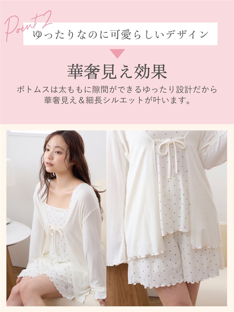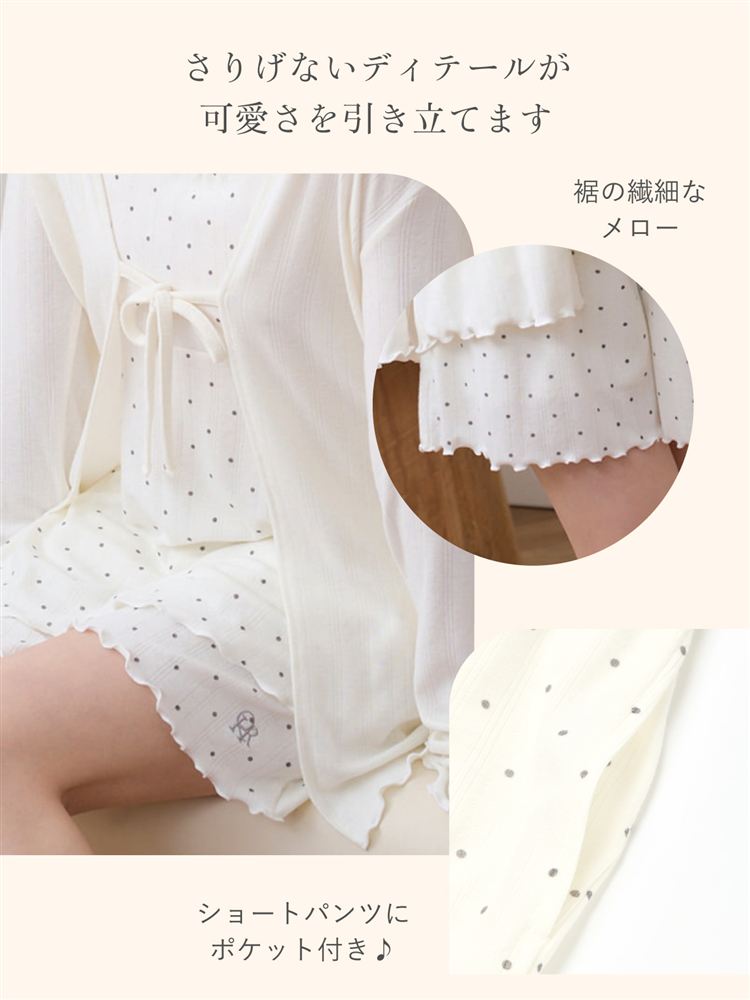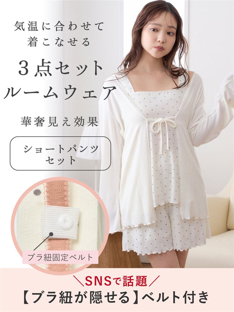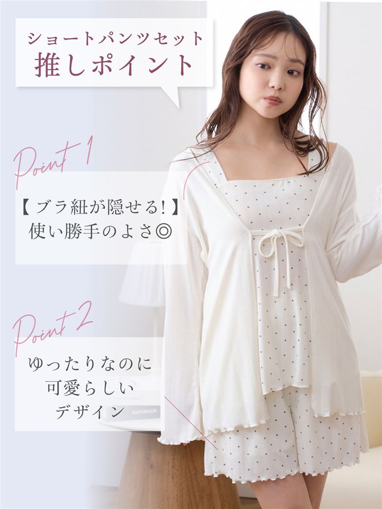 こちらのページは、【ブラ紐が隠せる】ショートパンツ ドット柄ルームウェア3点セットというルームウェア(部屋着)の商品詳細ページです。