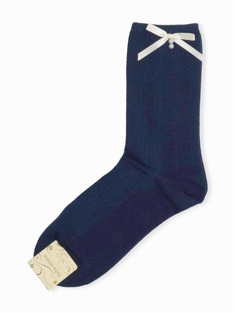 綿混リボンくま刺繍タック編みソックス