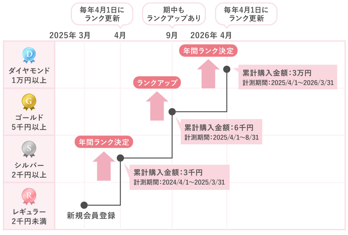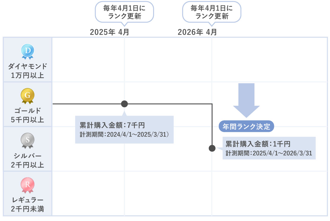 毎年4月1日に過去1年間のお買上げ商品金額に応じて会員ランクが更新されます。